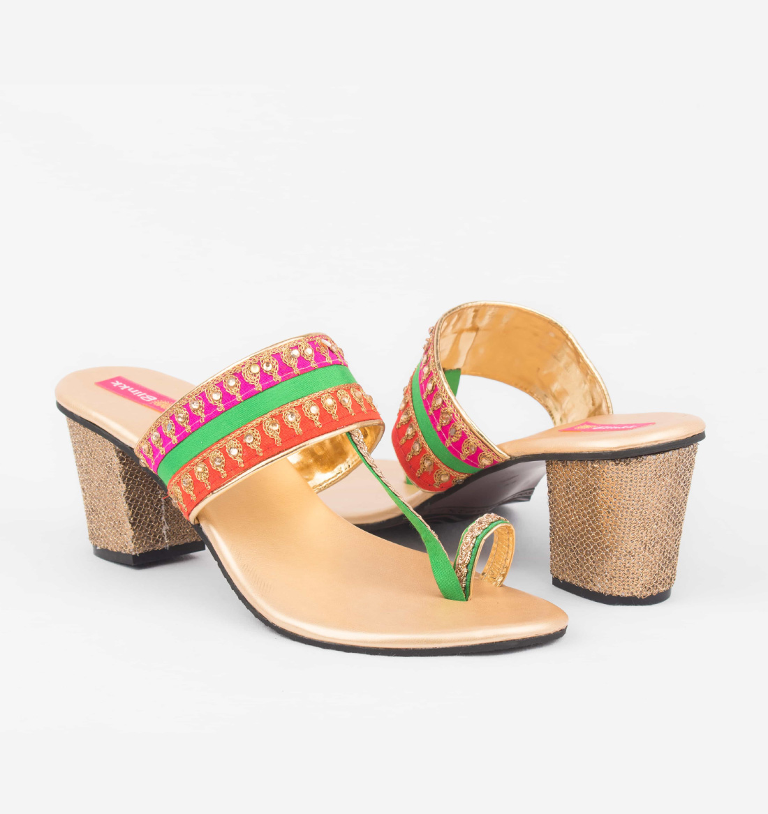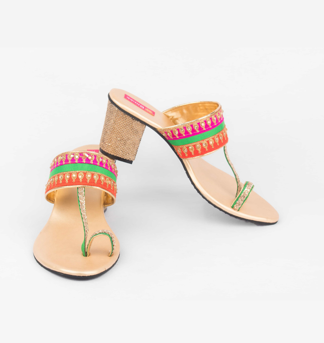 A pair of easy going and stylish box heeled sandals customized in dual tone and zari embroidery. Pair them with your anarkali set for a stylish appeal.
