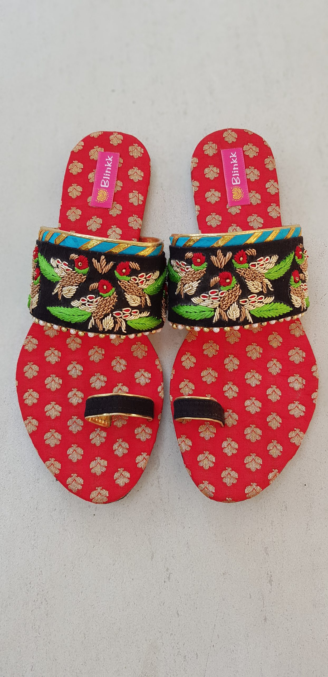 Exquisitely handcrafted pair of ethnic flats customized with parrot motifs in zardosi and thread embroidery with red buttis brocade. Style them with with your tunics for effortless charm and comfort.