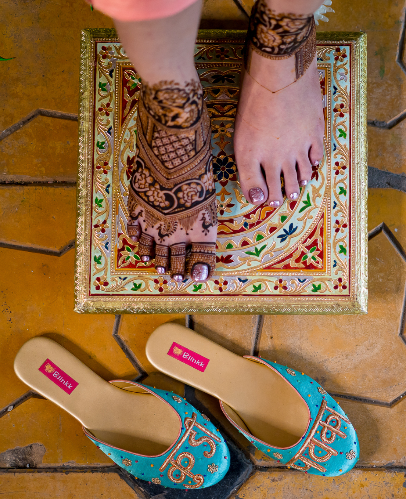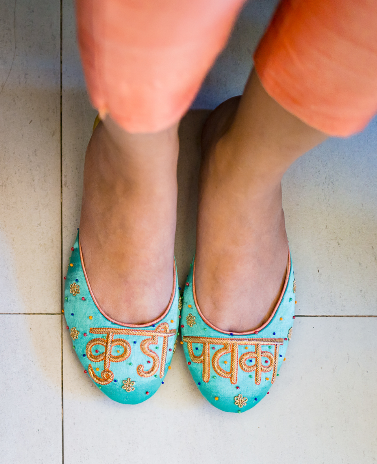 Hand embroidered pair of slip on mojadis with beautiful kudi pataka motif in zardosi and multicolor pearl work. Add this pair to your wardrobe for that perfect bling.