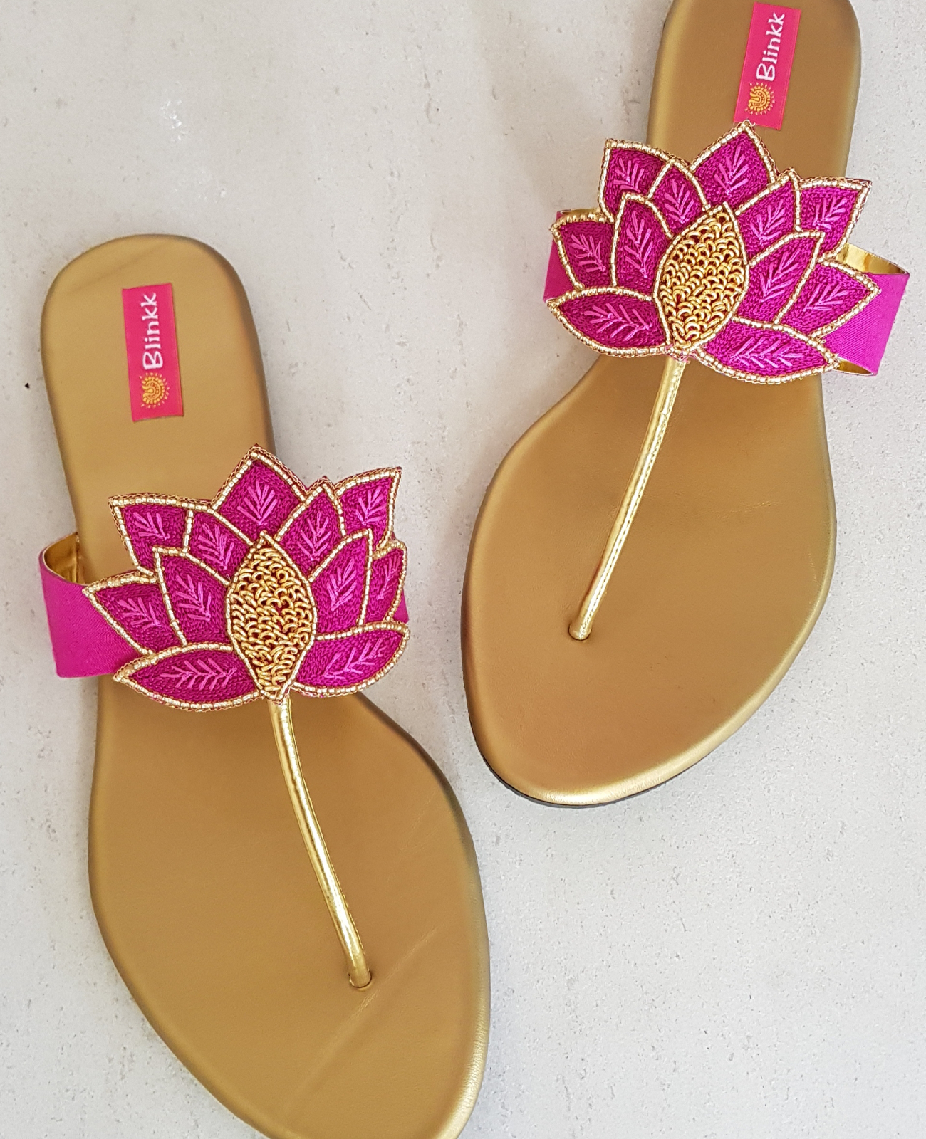 Exquisitely handcrafted pair of ethnic flats customized with a lotus motif in zardosi, golden beads and thread embroidery. Style them with with your tunics for effortless charm and comfort.