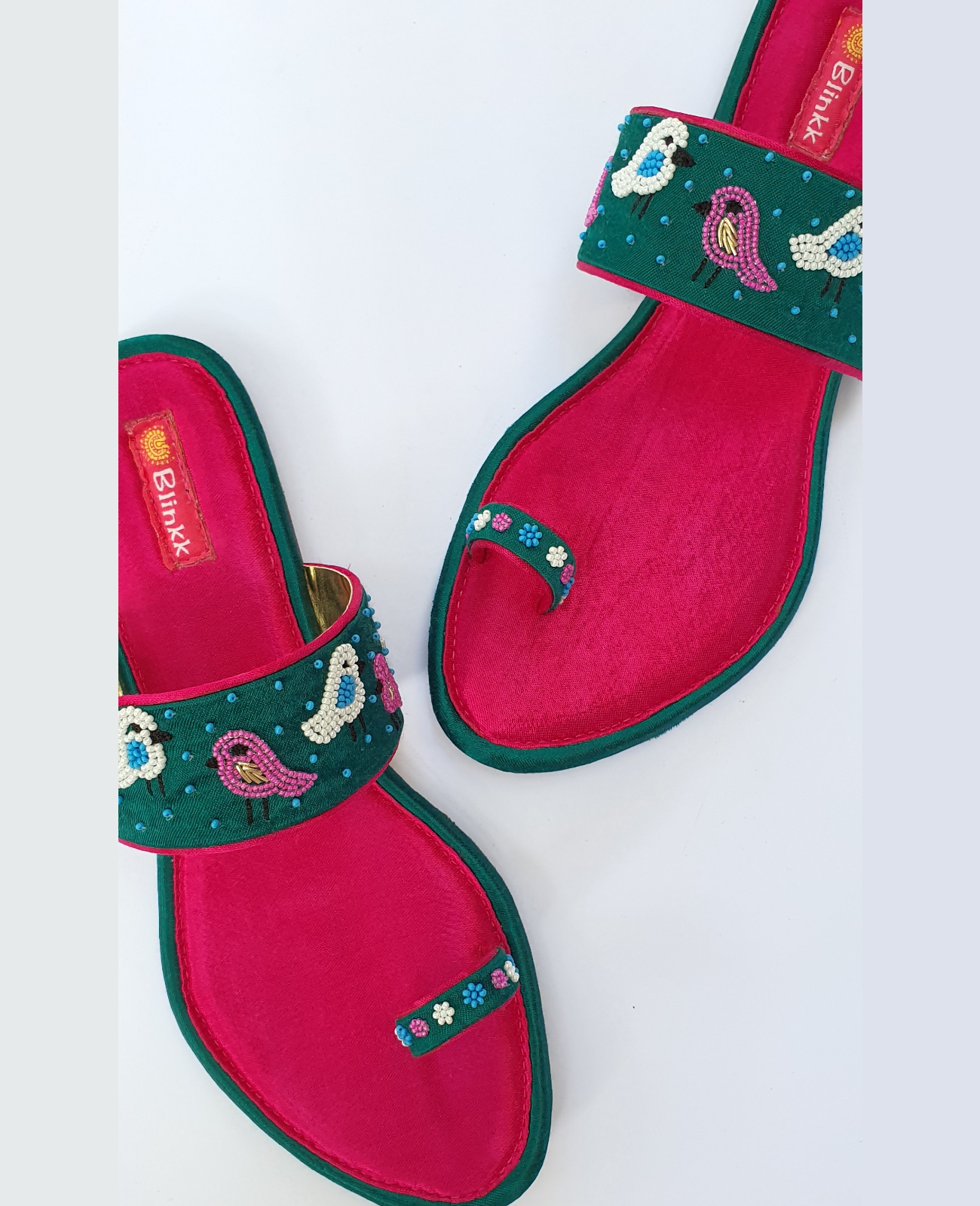 A pair of flats designed with song birds motif in multicolor beads. Pair it with floral top and denims for that perfect summer look.