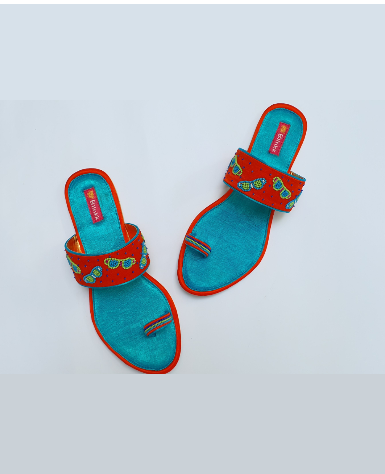 A pair of flats designed with sunglasses motif in multicolor beads. Pair it with floral top and denims for that perfect summer look.