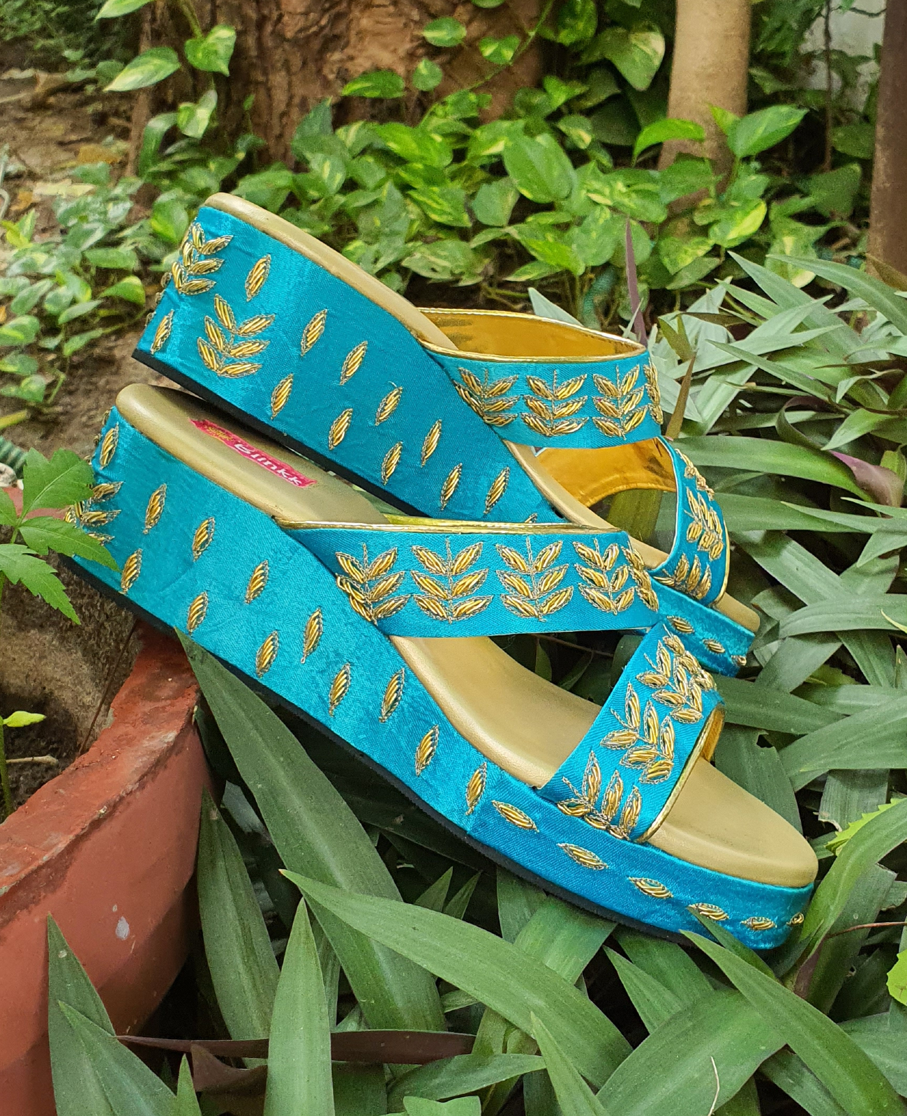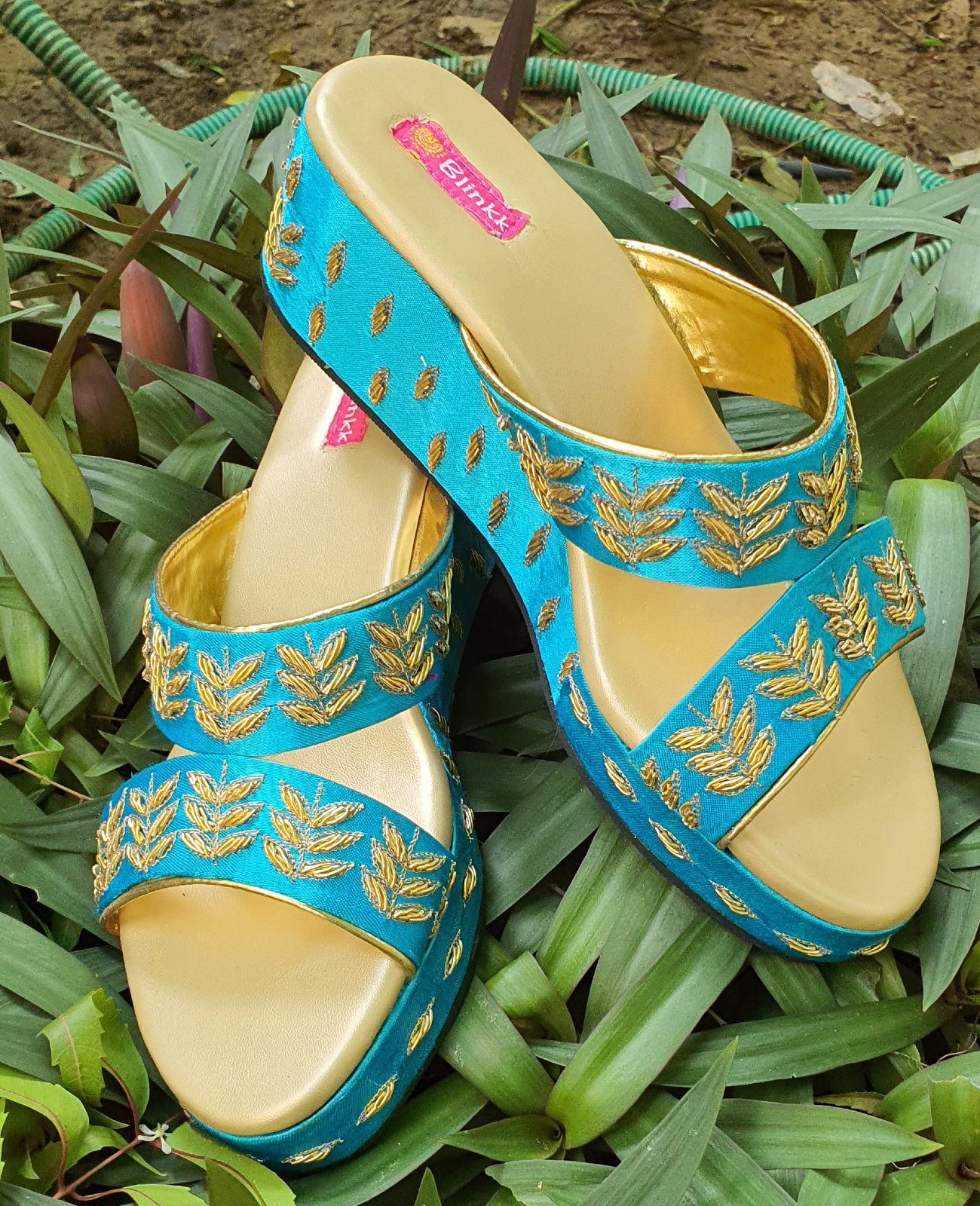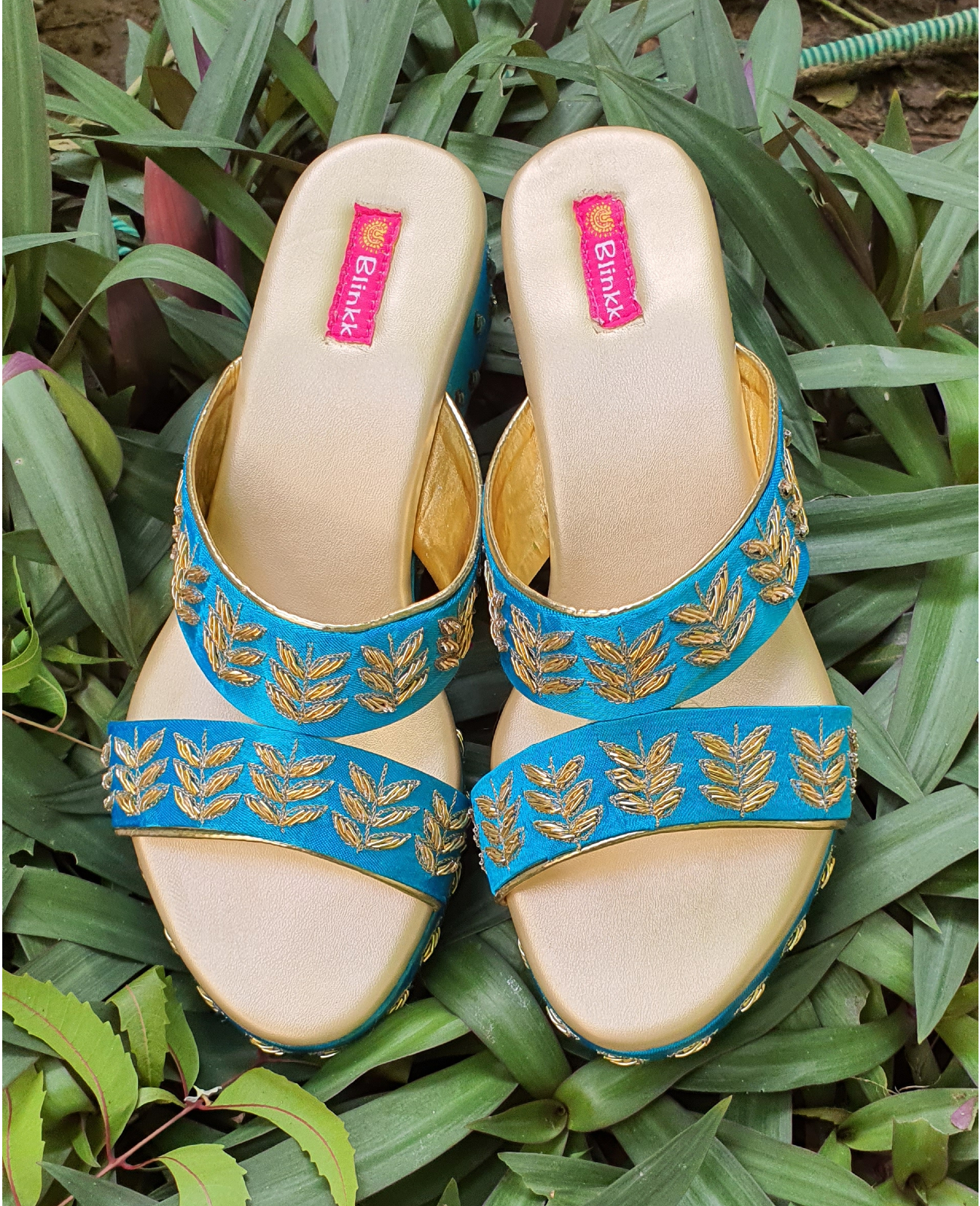 A pair of ethnic heels crafted in blue with golden zardosi embroidered details. Style them with your saree or lehenga for a comfy ethnic look.