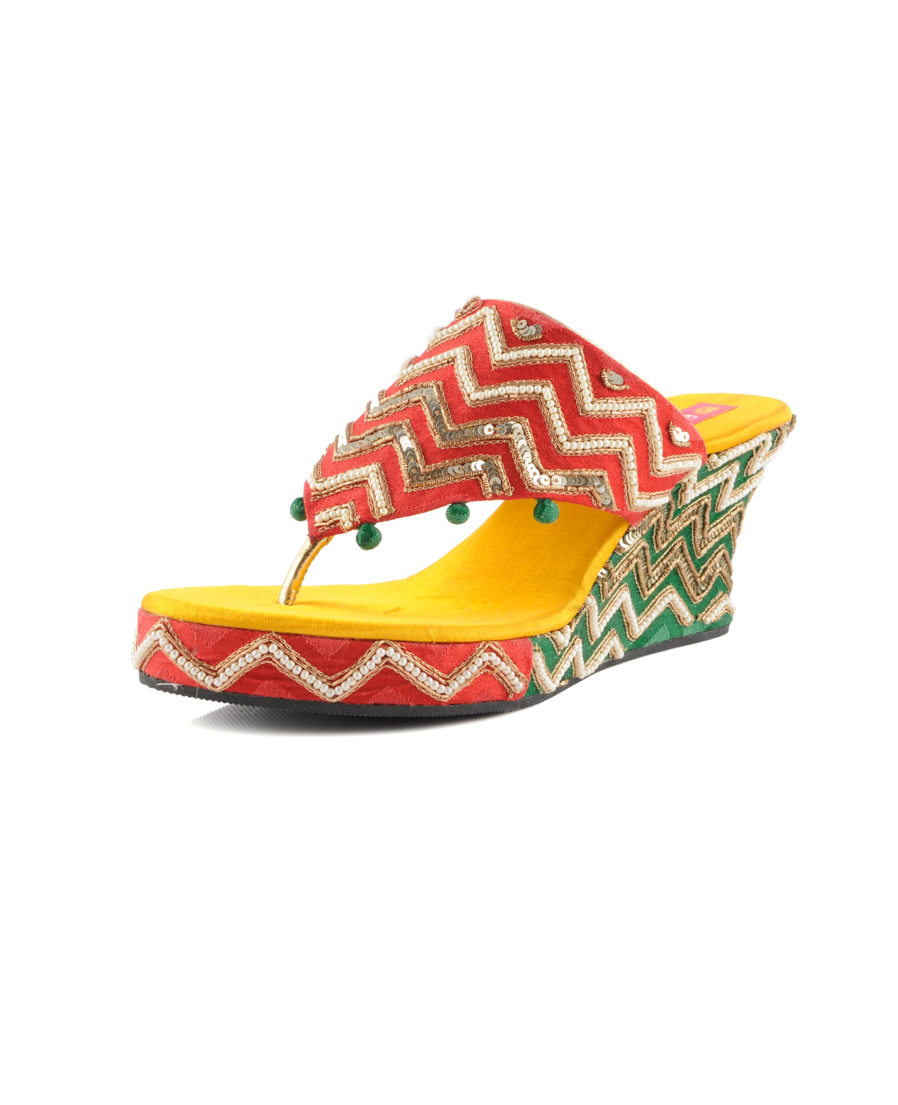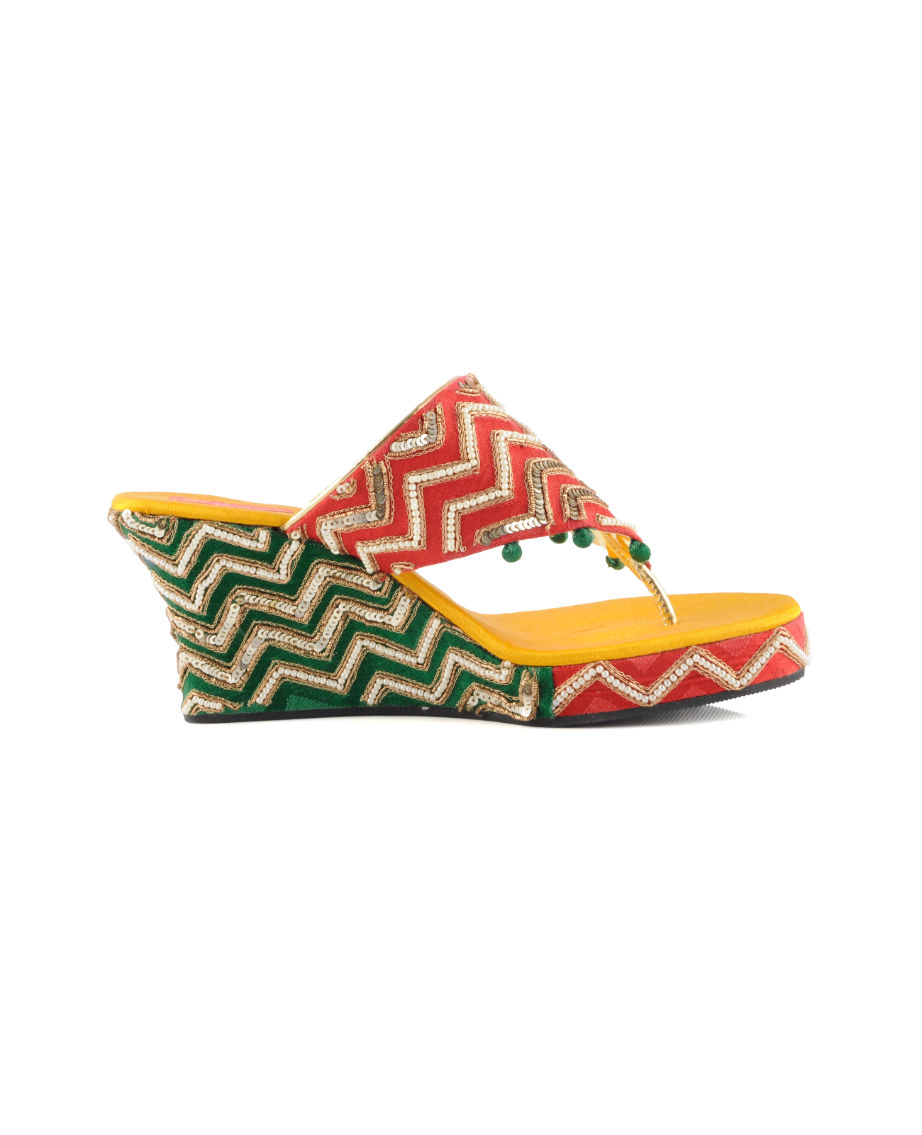 A pair of platforms designed in evergreen color combination of red, yellow and green and embellished with zardosi, sequence and pearls hand embroidered details. Pair it with a saree, lehenga or kurta-pants set for a royal look.