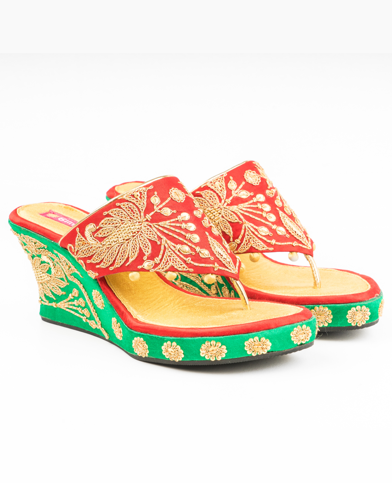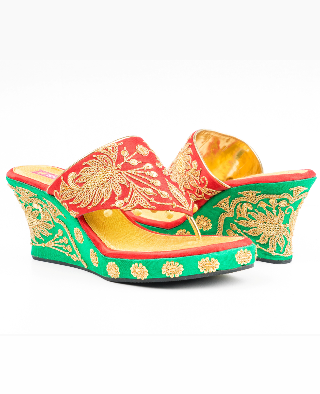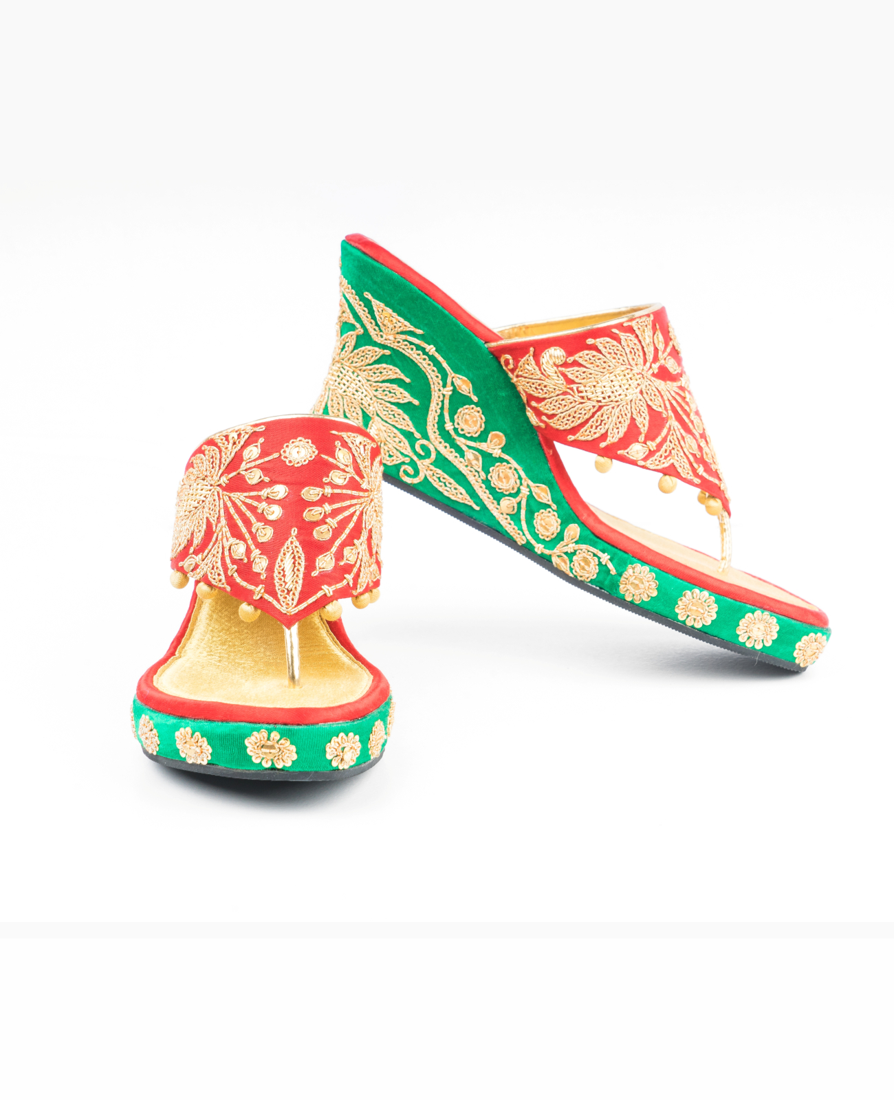 A pair of platforms designed in evergreen color combination of red, gold and green and embellished with marodi hand embroidered details. Pair it with a saree, lehenga or kurta-pants set for a royal look.