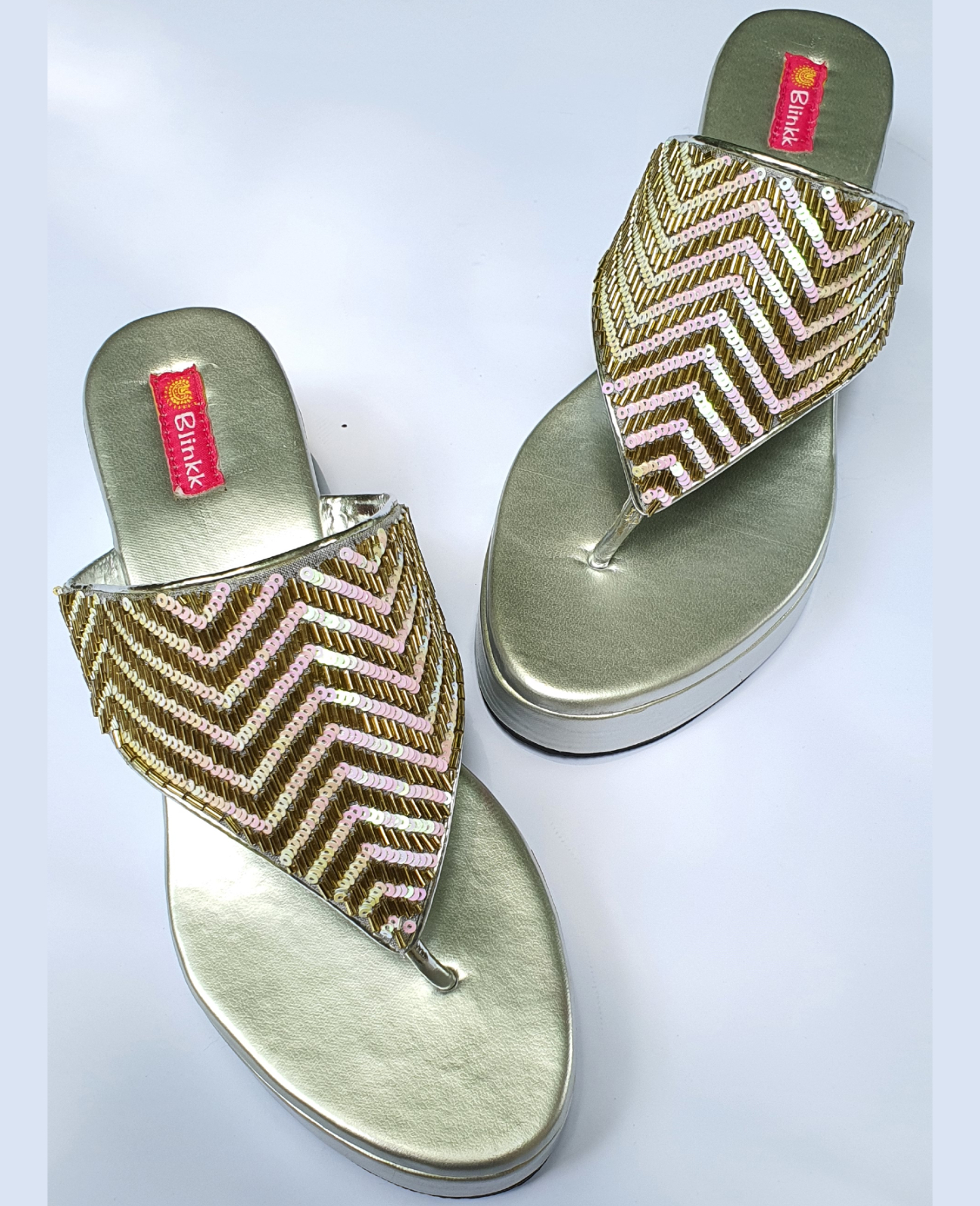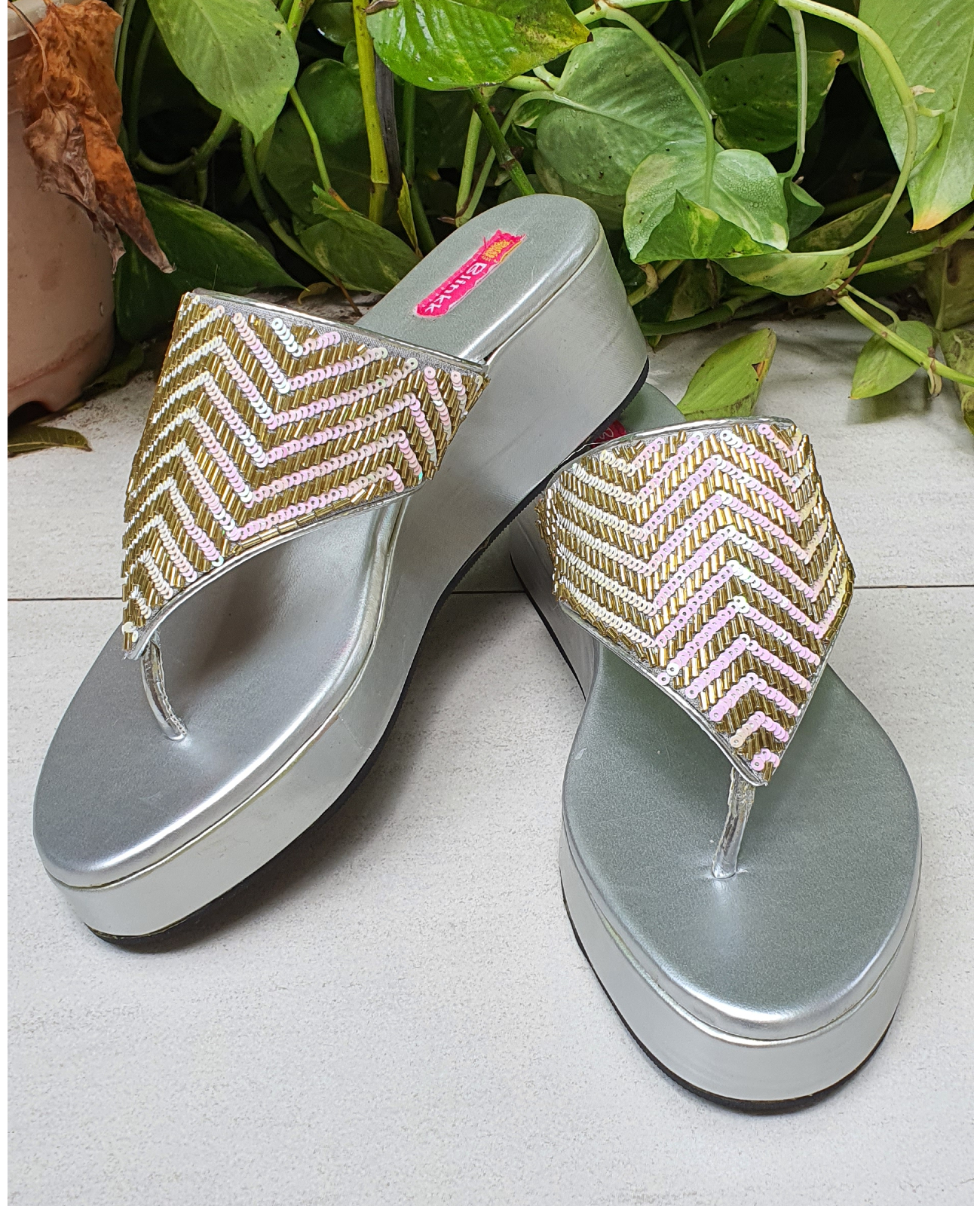 Crushing over this pair of gold and silver heels! White Sequence and Gold Piping Handwork on strap with plain silver heels. Pair them with a anarkali or lehenga or saree to make a statement.