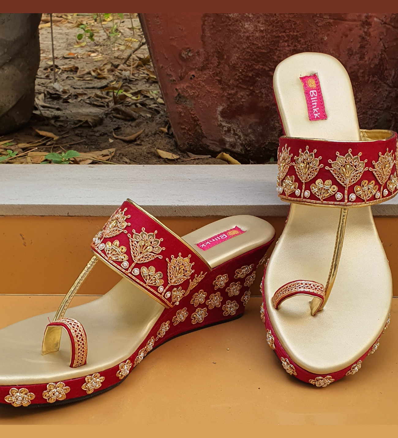 A pair of platforms designed in maroon embellished with marodi hand embroidered details. Pair it with a saree, lehenga or kurta-pants set for a royal look.
