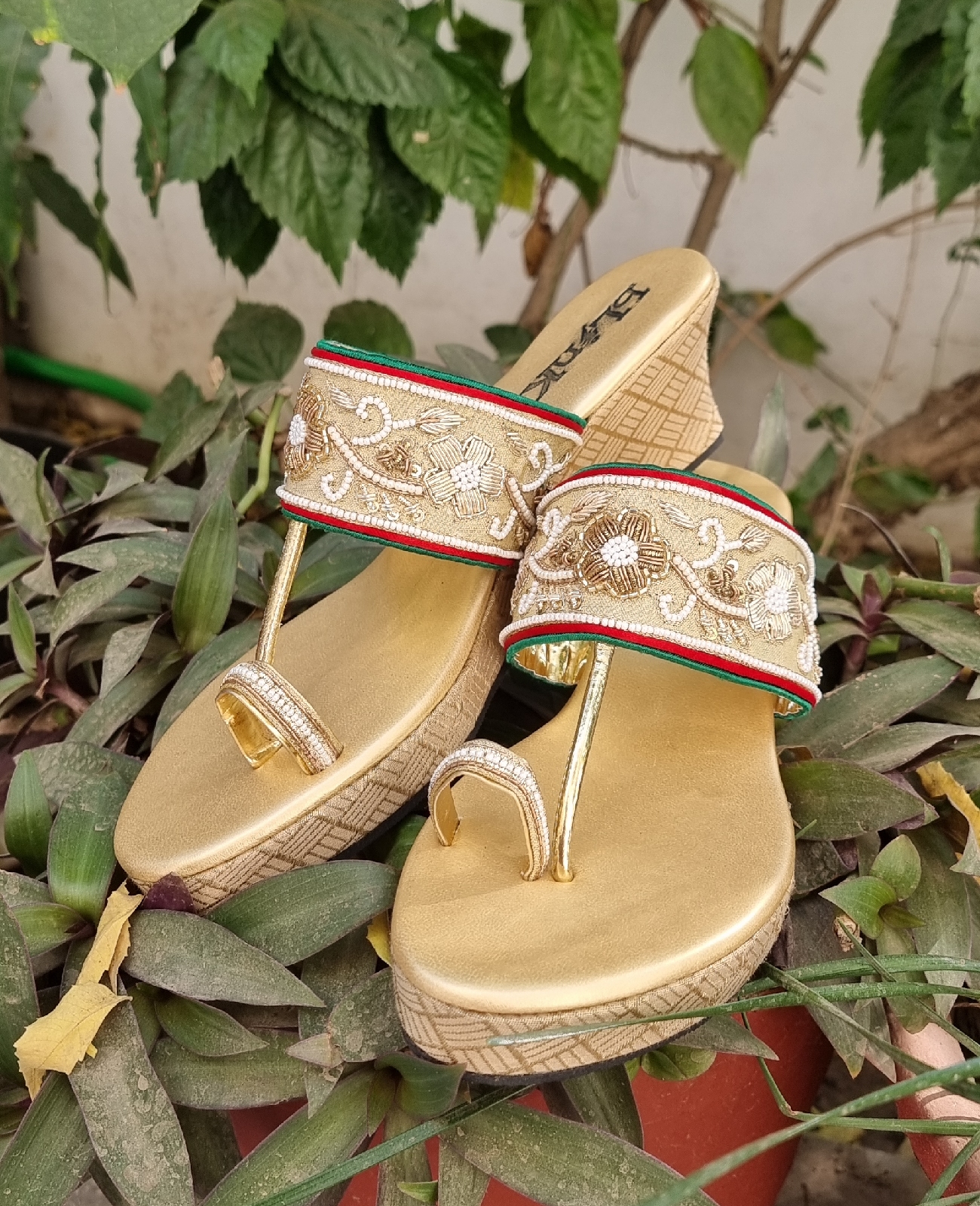 A pair of dazzling platforms made with zardosi and pearl handwork for a bling with a hint of red and green. Style it with a lehenga to complete your look.