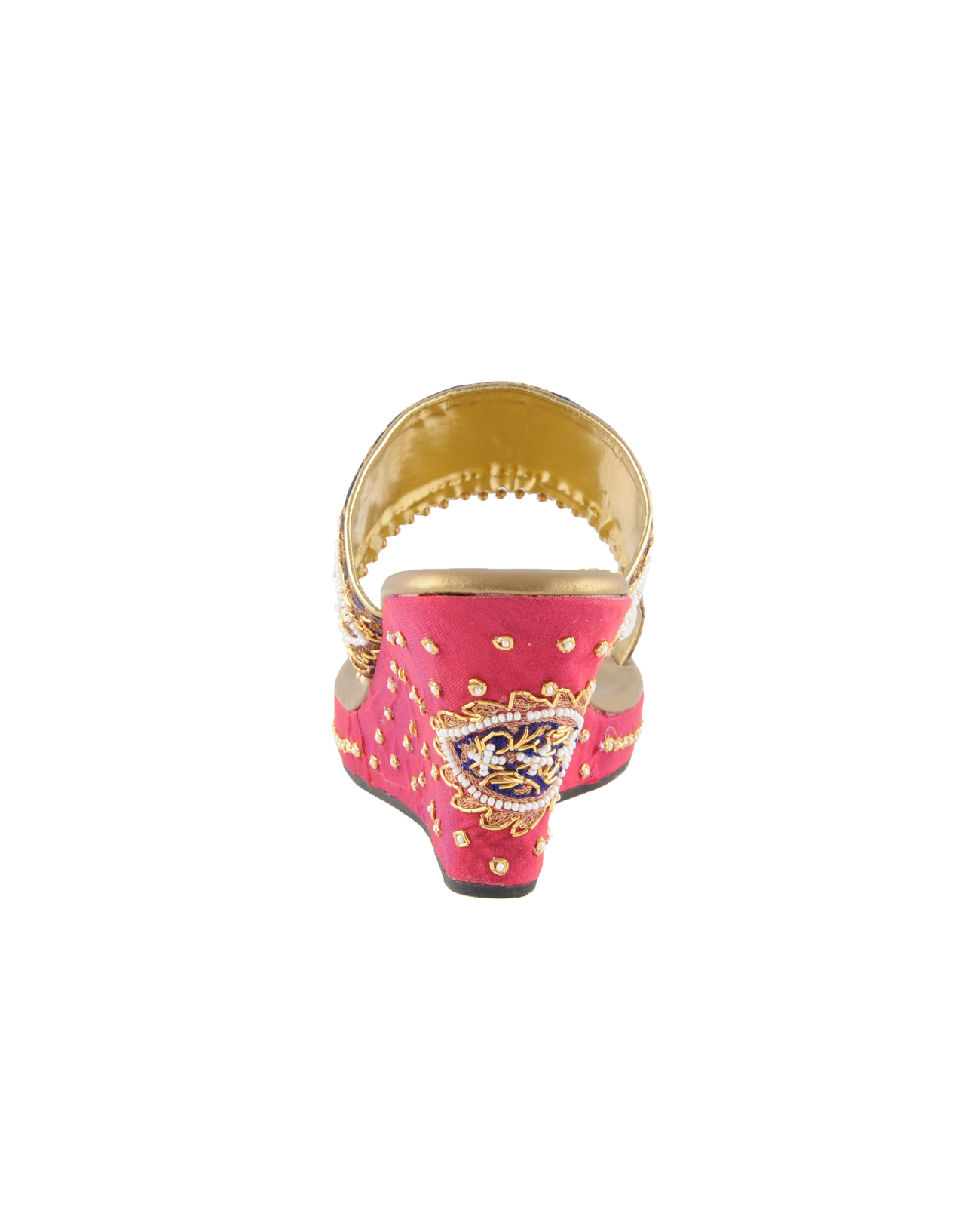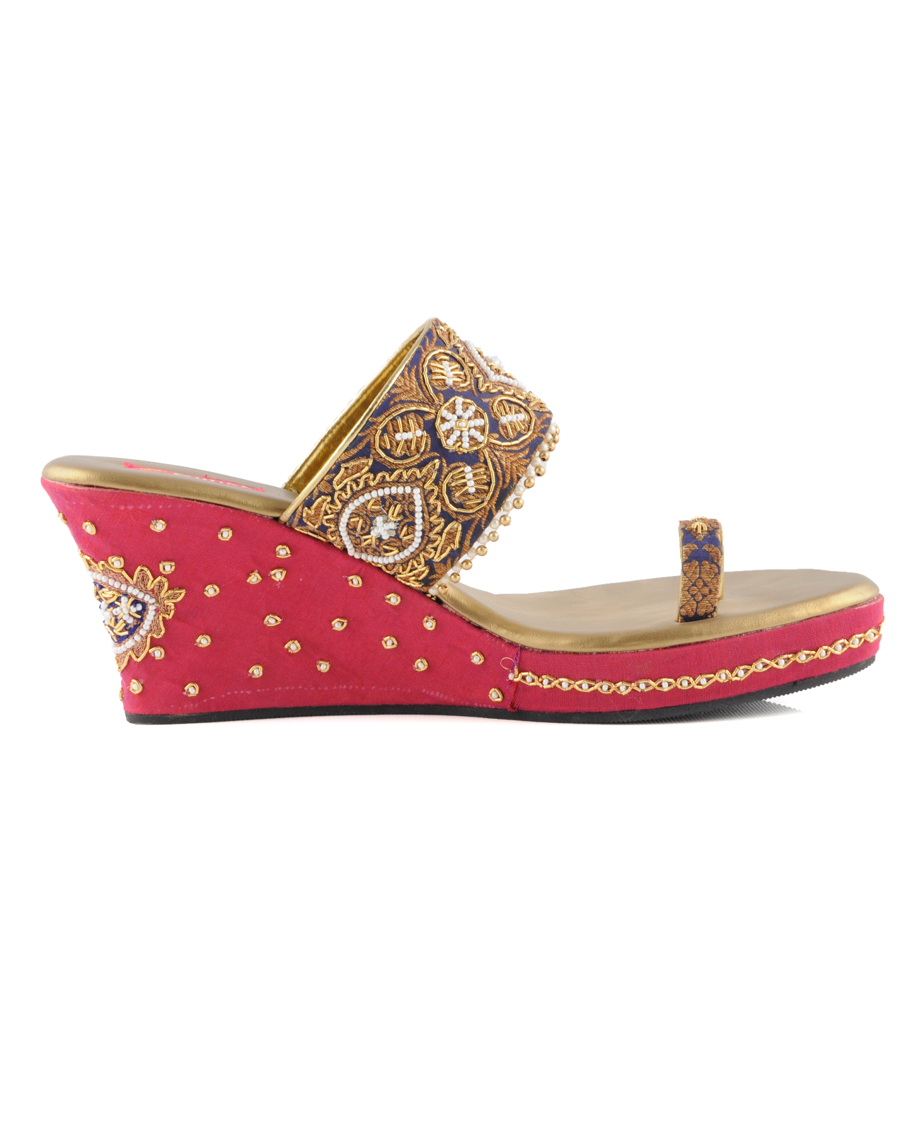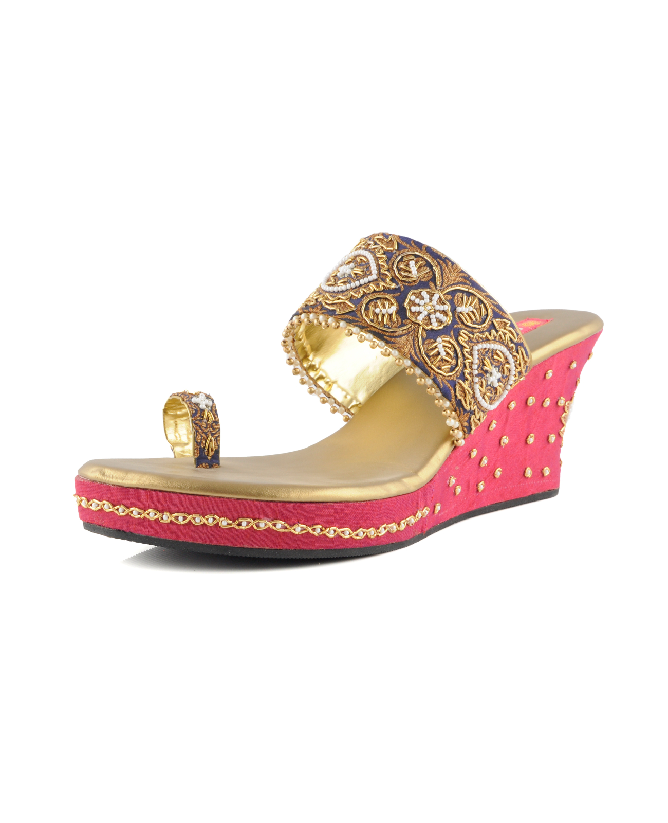 A pair of platforms designed in navy blue and pink embellished with exquisite pearls and zardosi hand embroidered details. Pair it with a saree, lehenga or kurta-pants set for a royal look.