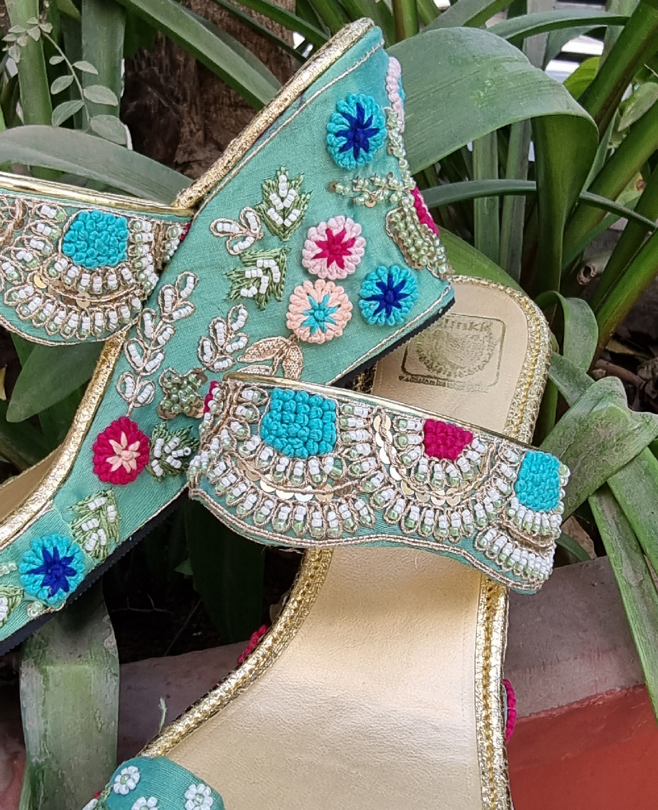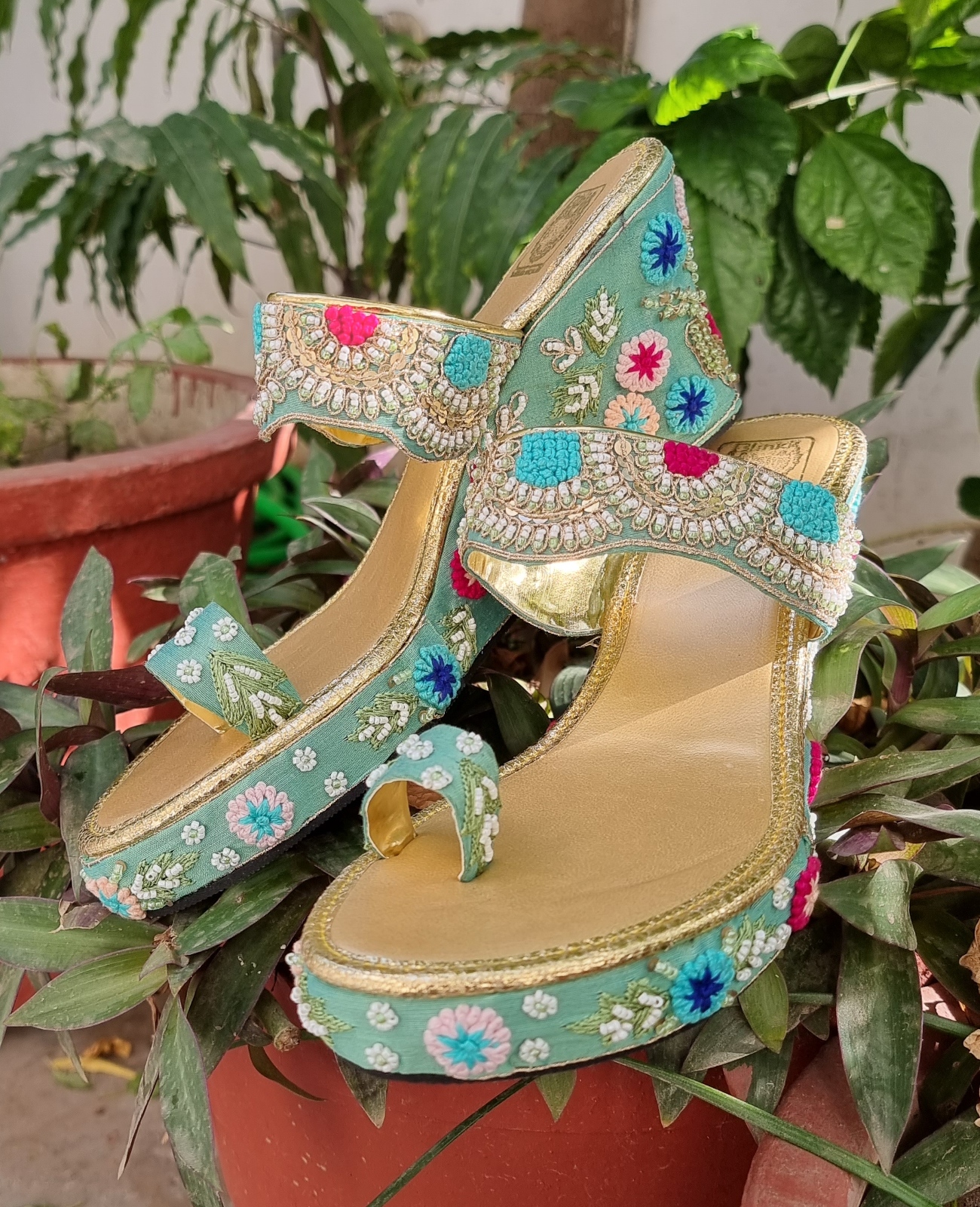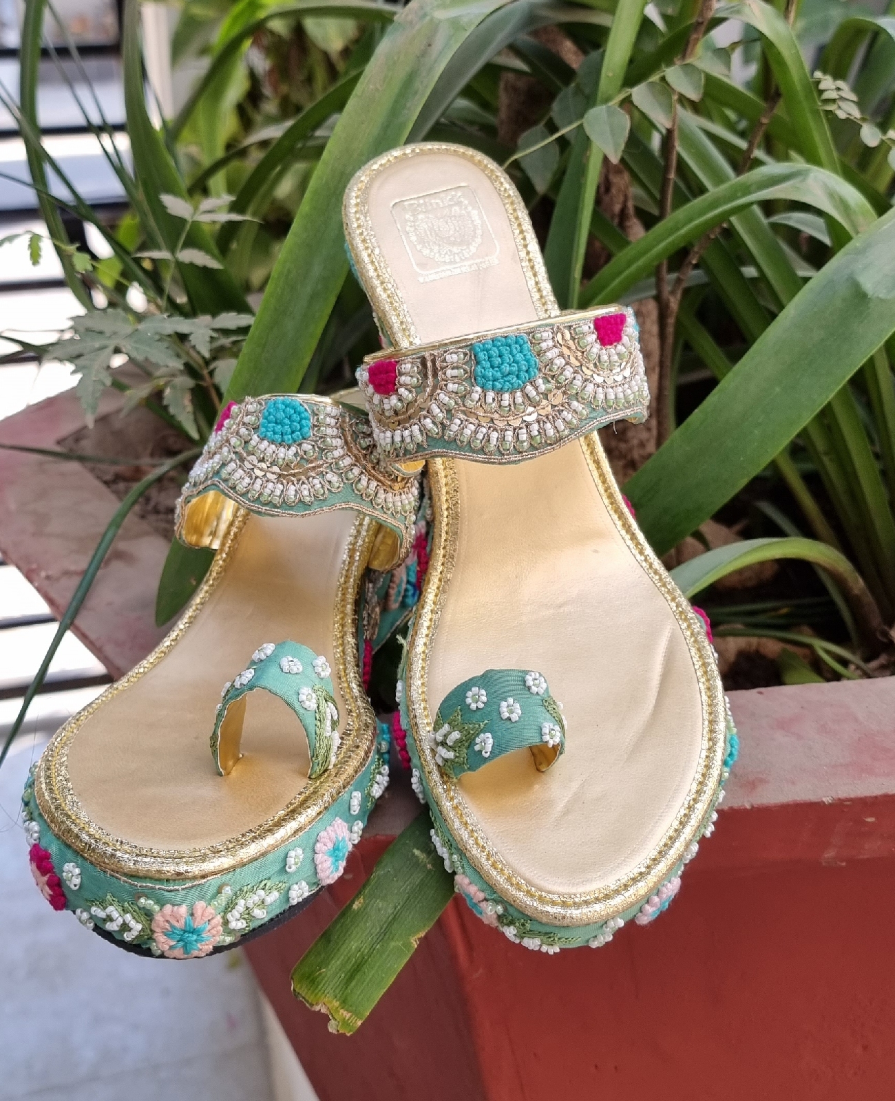 A pair of ethnic heels crafted in pista green with thread embroidered floral motifs details with multicolor threads and zardosi and pearls embellishments. Style them with your bridal lehenga for your wedding day.