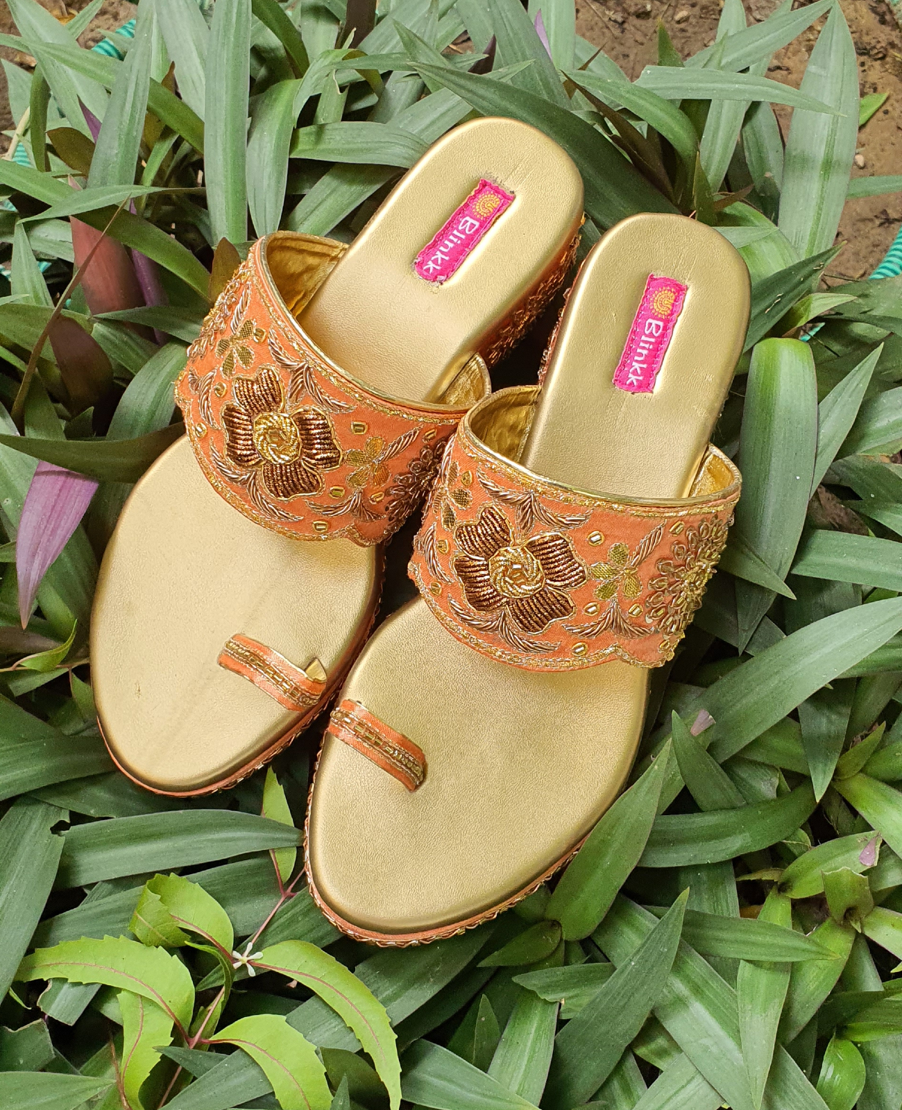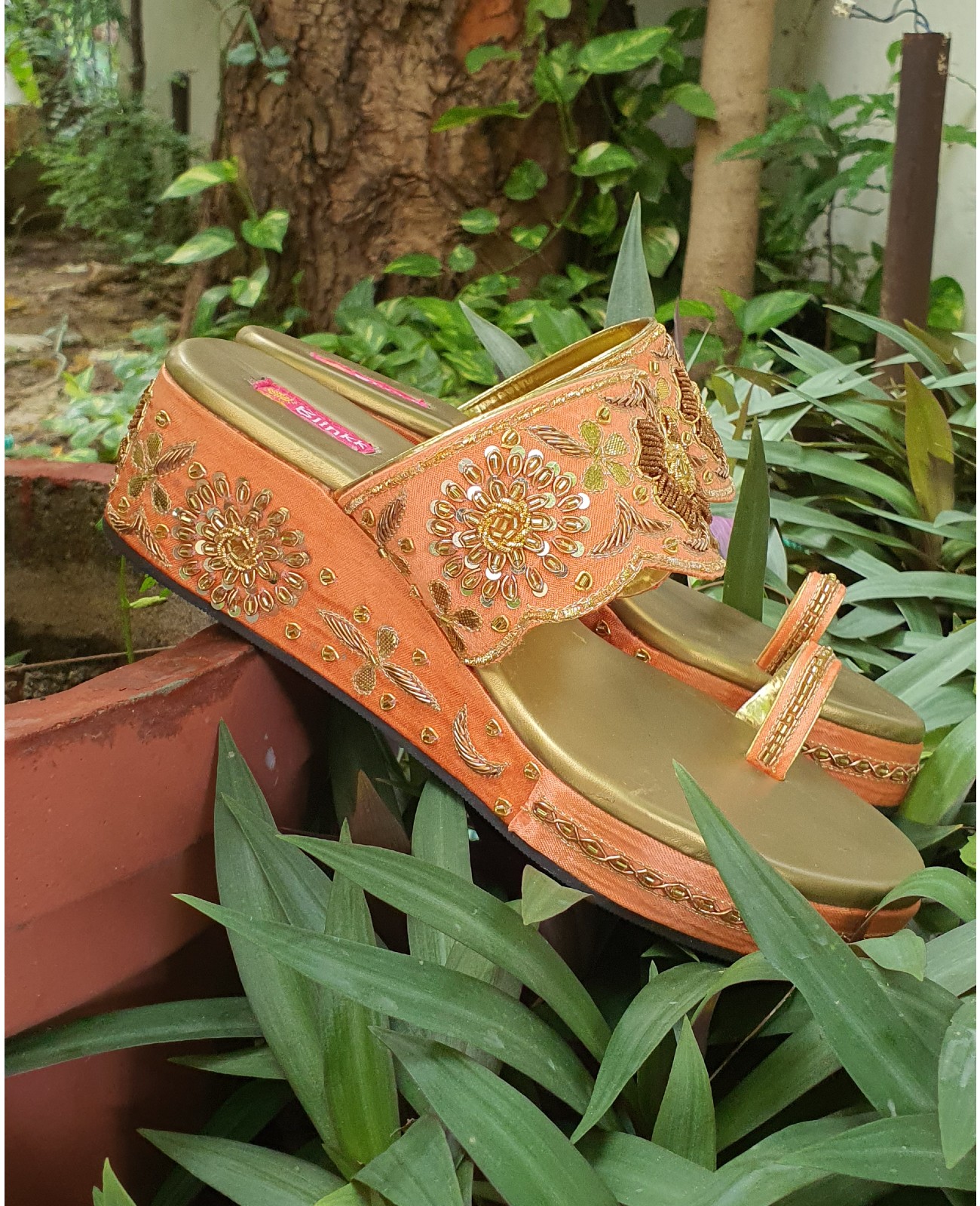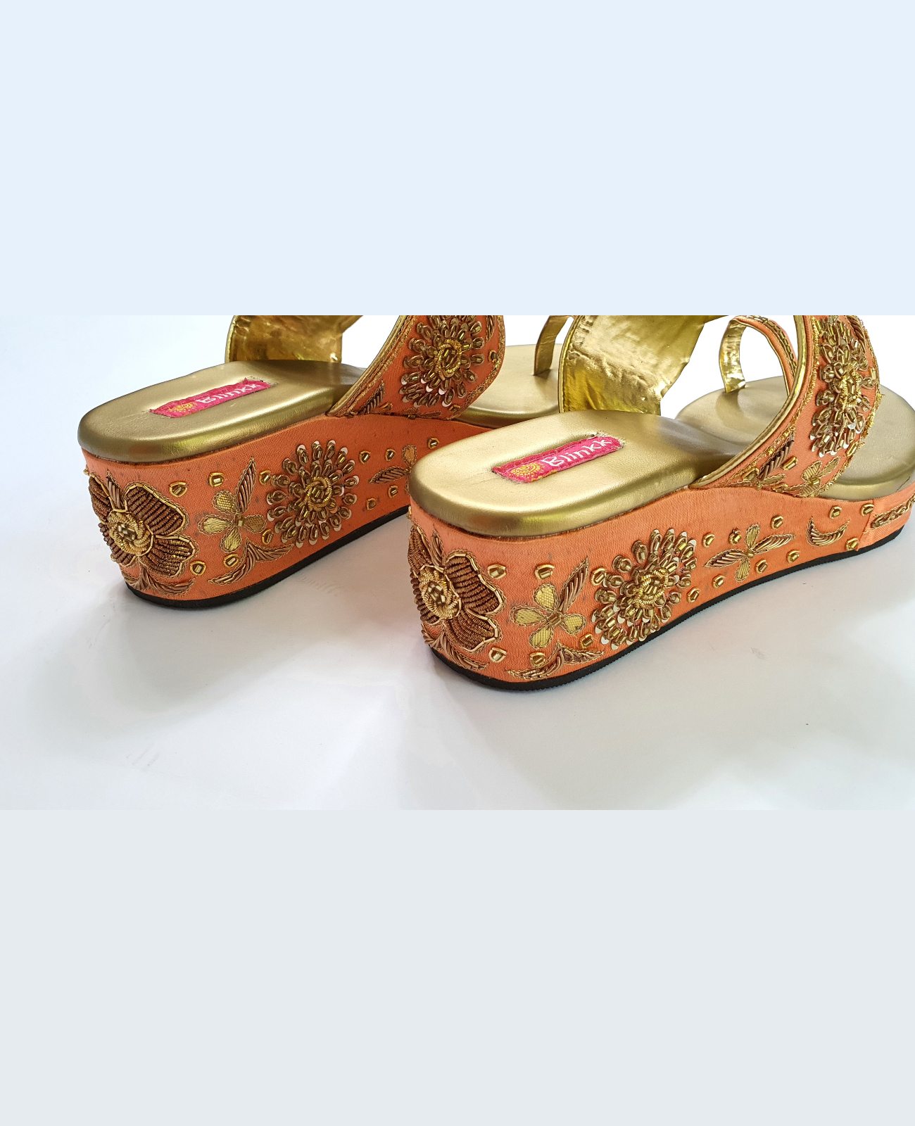 A pair of ethnic heels crafted in peach with golden zardosi embroidered details. Style them with your bridal lehenga for a comfy ethnic look.