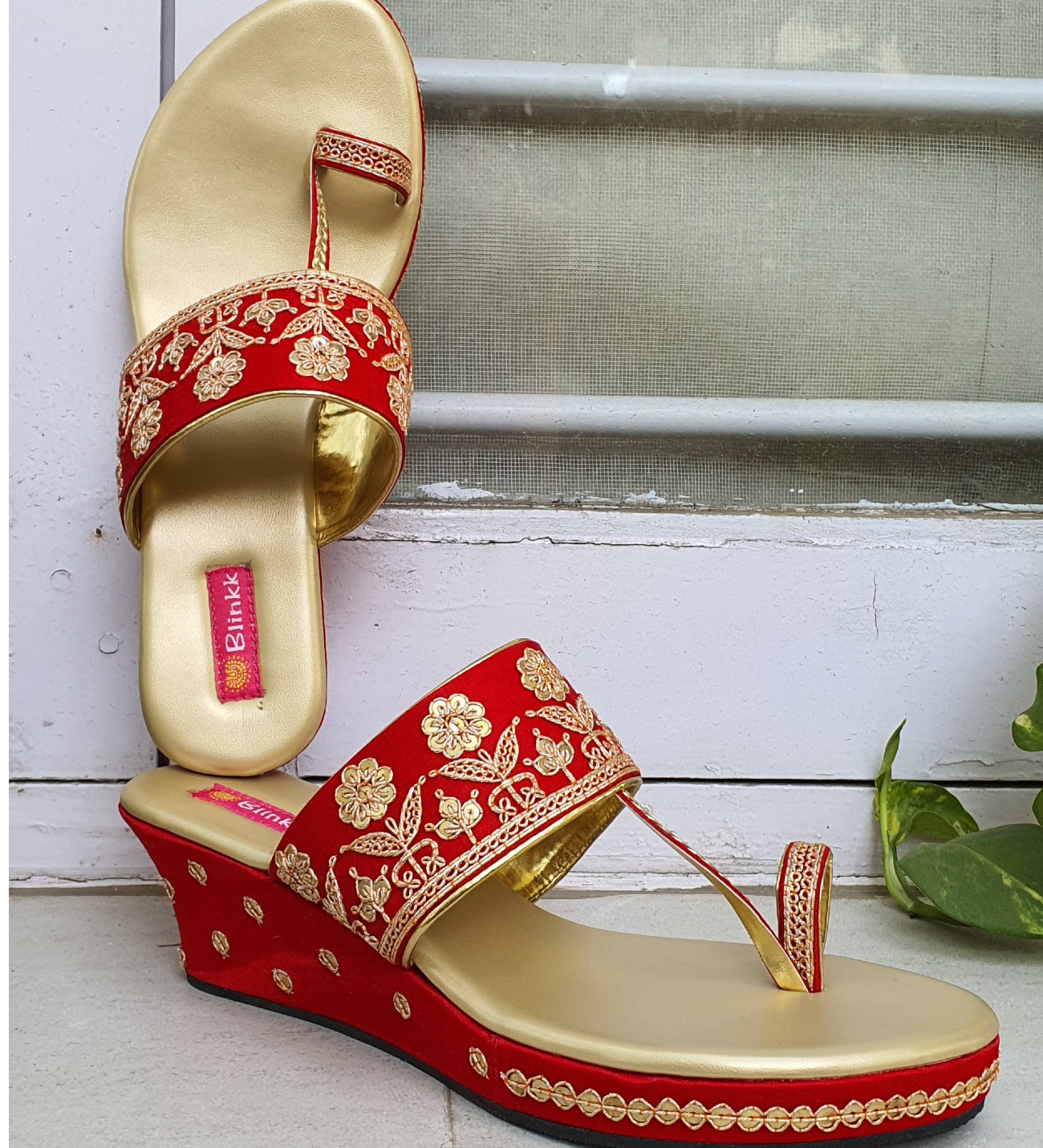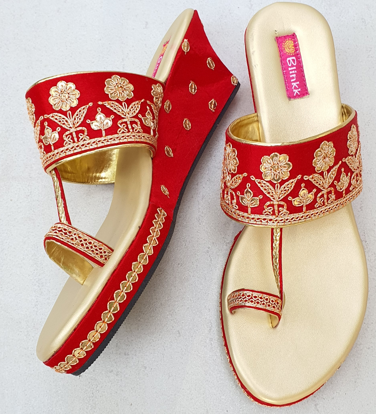 A pair of platforms designed in red embellished with marodi hand embroidered details. Pair it with a saree, lehenga or kurta-pants set for a royal look.