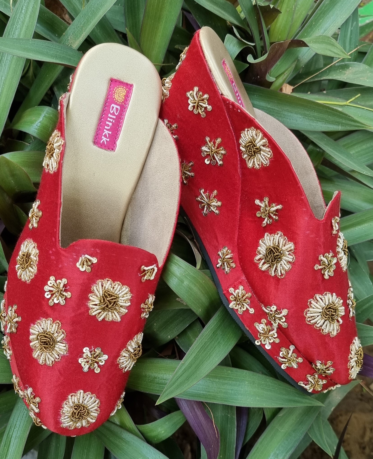 Heavily hand embroidered pair of slip on mojadis with beautiful zardosi work in platform heels. Add this pair to your wardrobe for that perfect look.