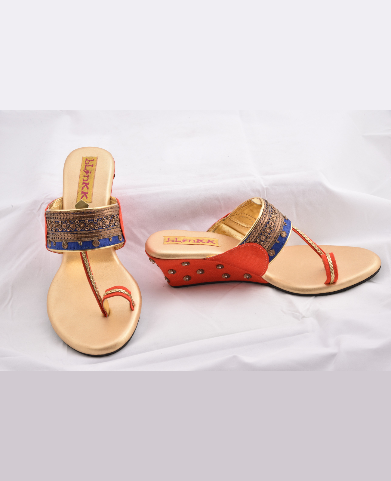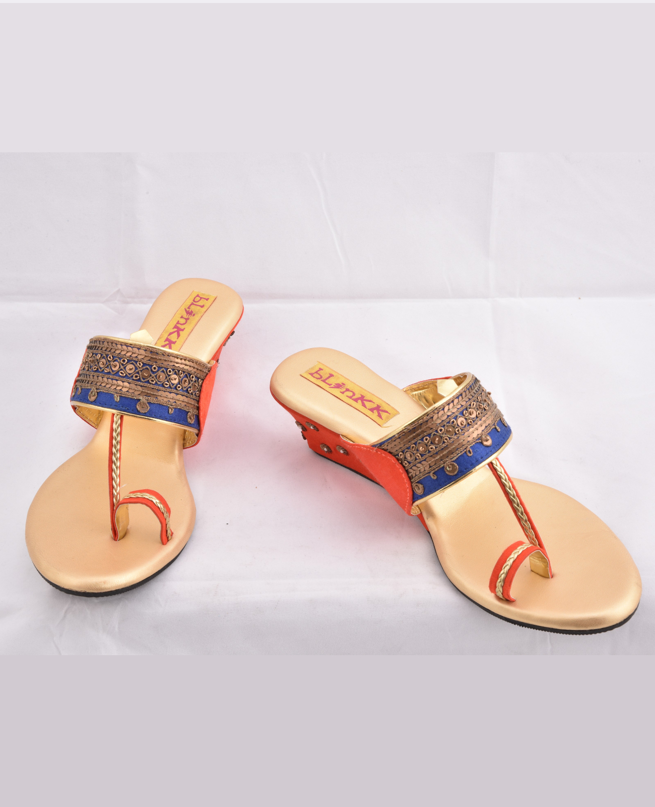 A pair of kolhapuri wedges designed with marodi hand embroidered details. Pair it with a saree, lehenga or kurta-pants set for a royal look.