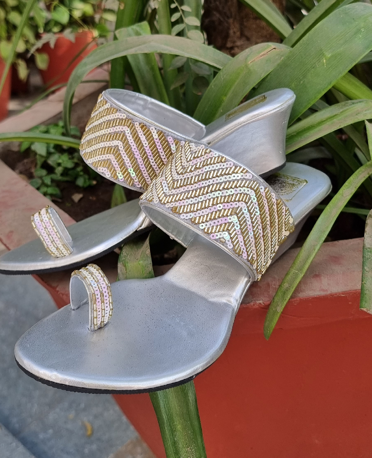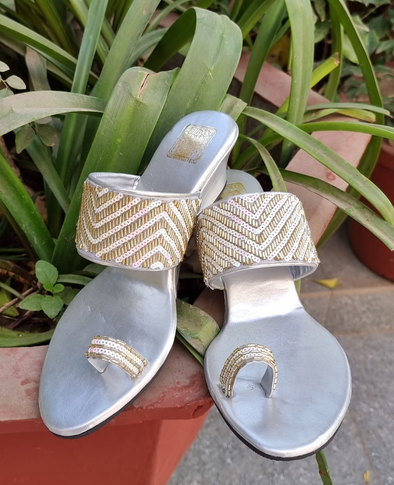 Crushing over this pair of gold and silver heels! White Sequence and Gold Piping Handwork on strap with plain silver heels. Pair them with a anarkali or lehenga or saree to make a statement.