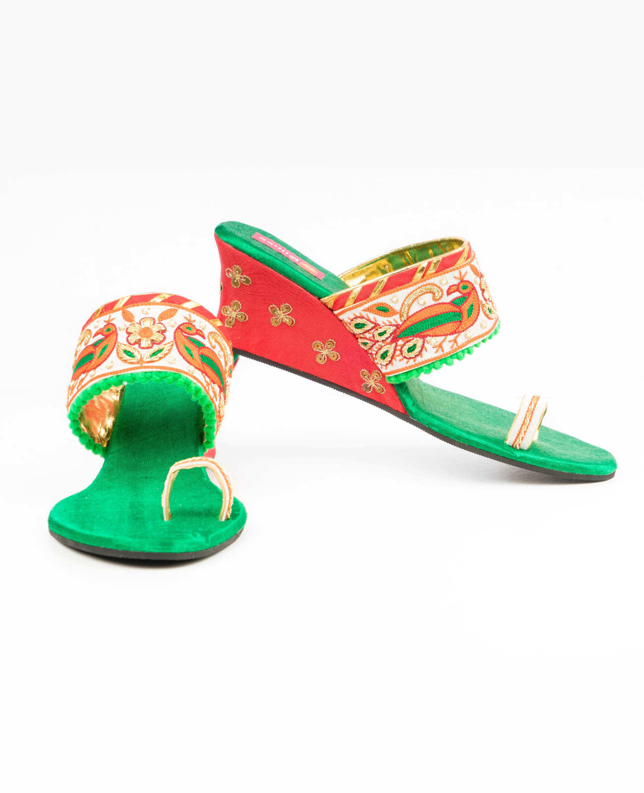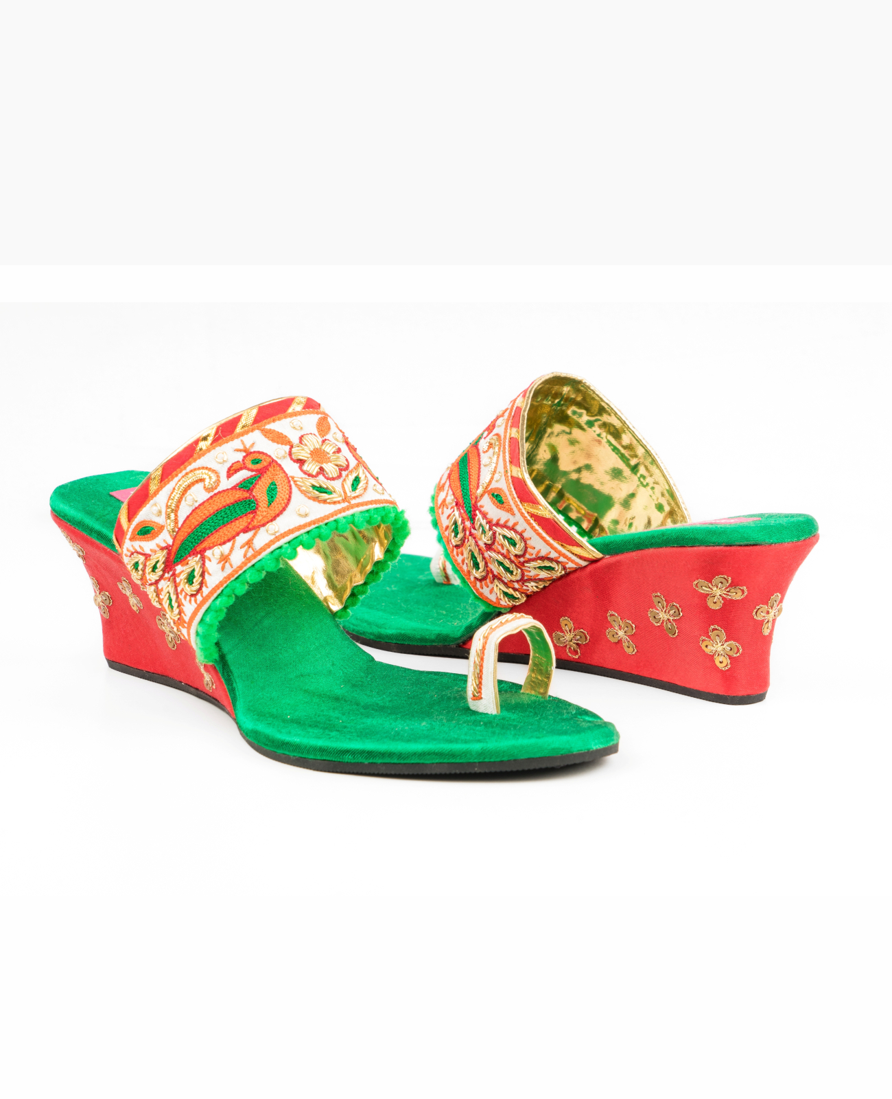 An ultra-stylish pair of wedges with dancing peacock motifs embroidered in zardosi and multicolor threads to enchance the dual tone. Style them with your kurti for a perfect look.