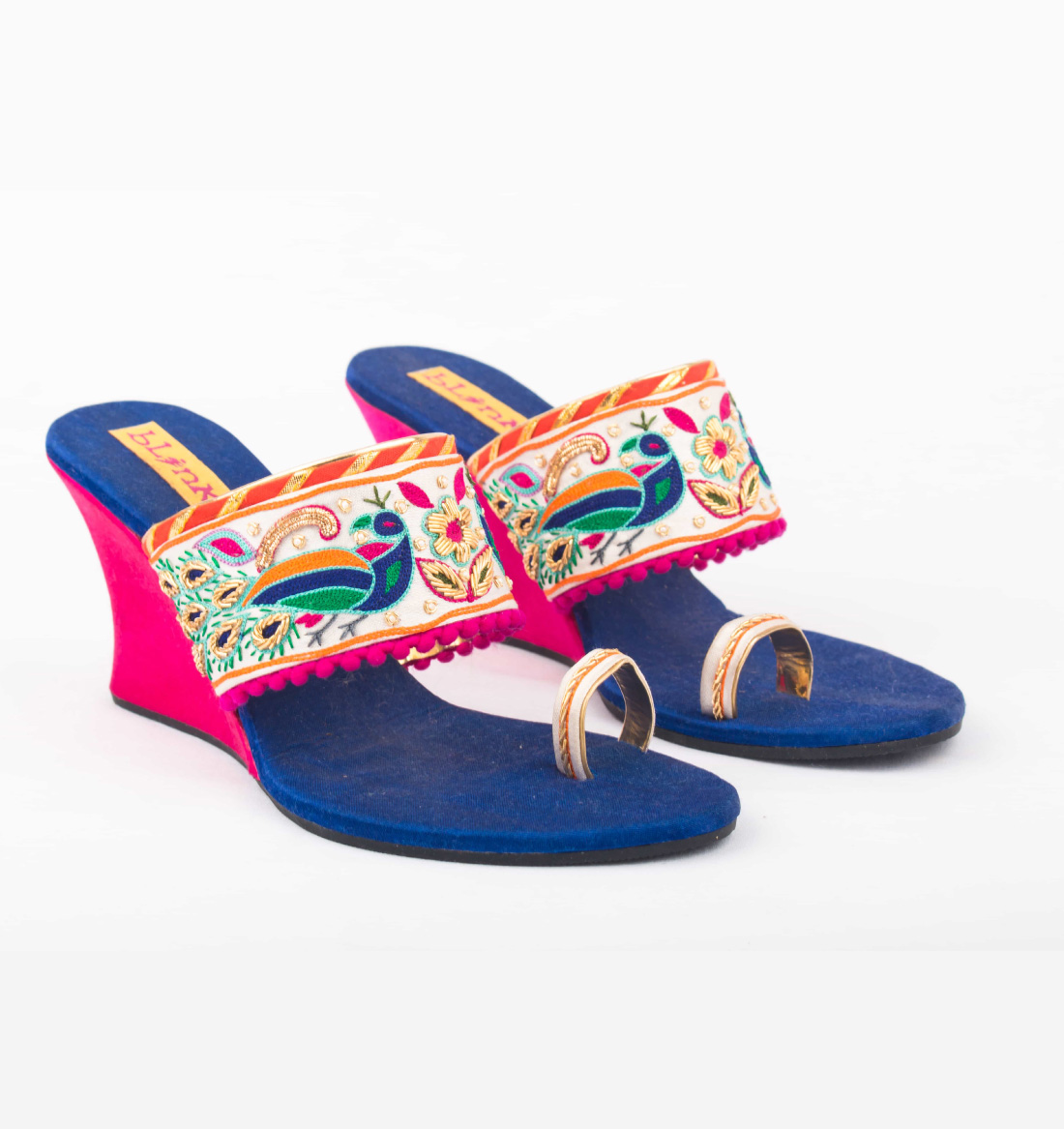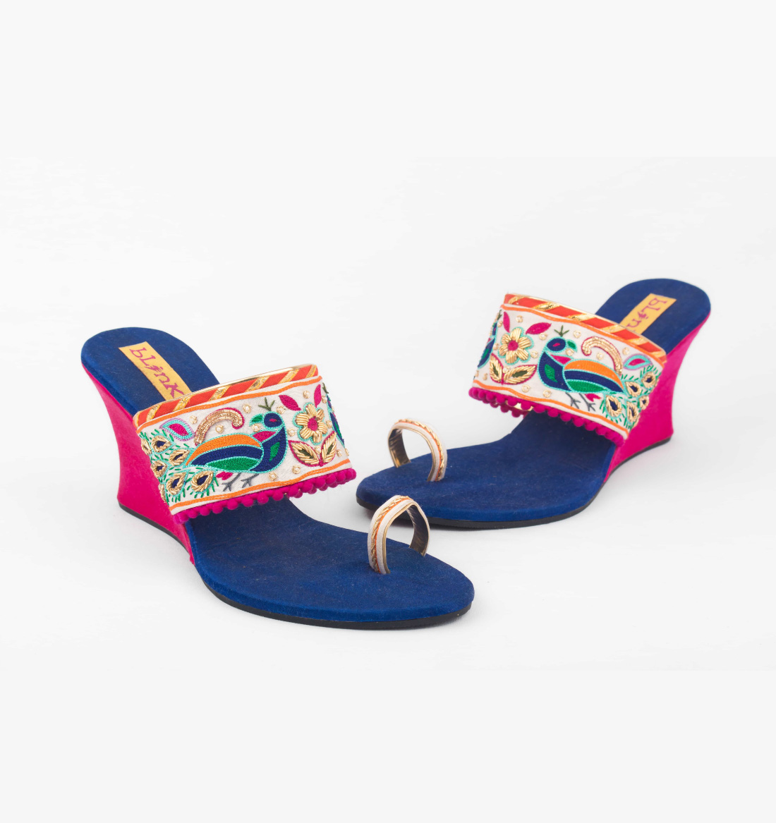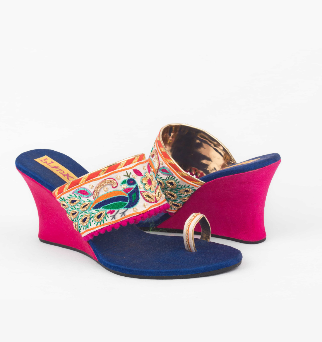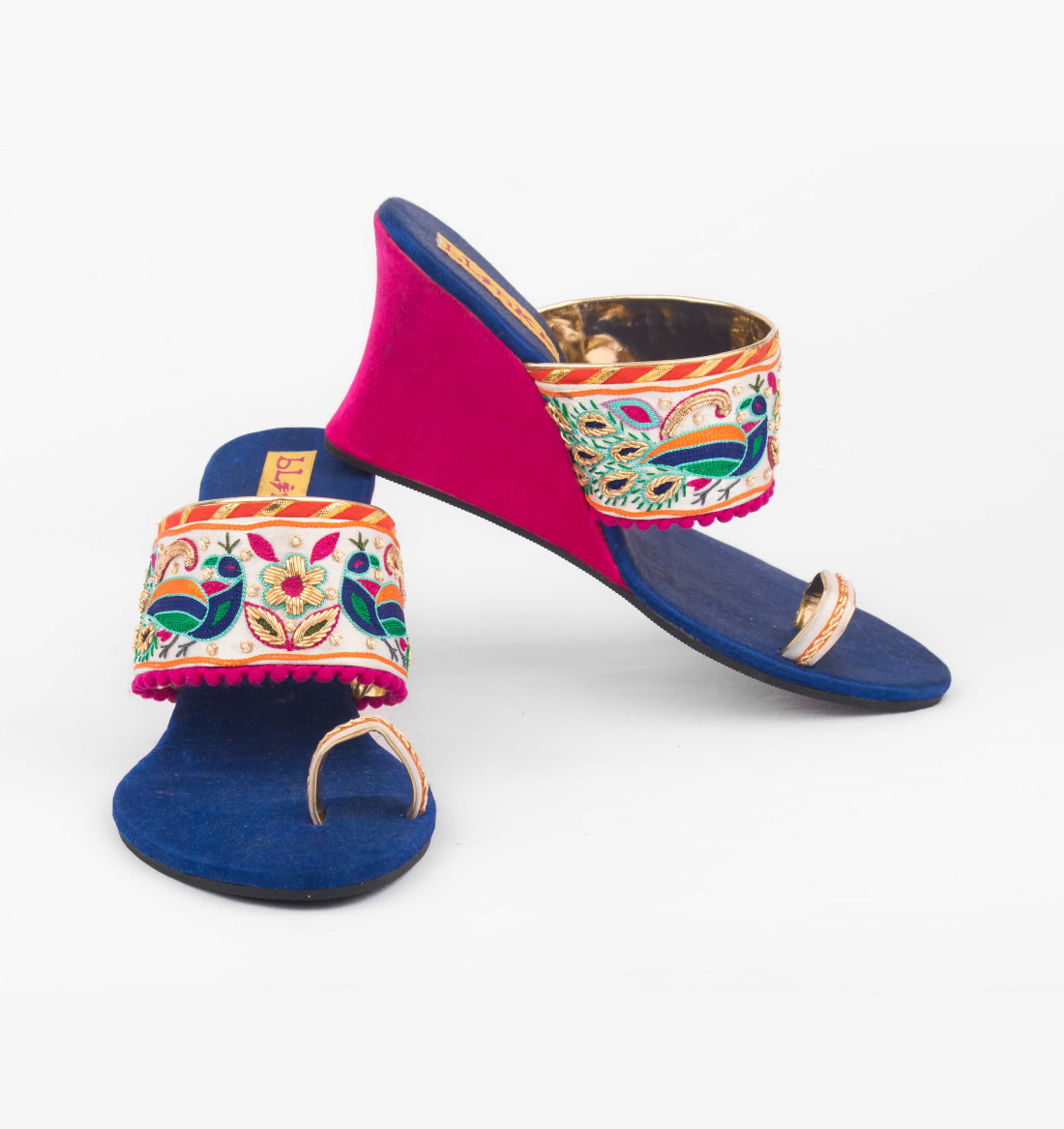 An ultra-stylish pair of wedges with dancing peacock motifs embroidered in zardosi and multicolor threads to enchance the dual tone. Style them with your kurti for a perfect look.