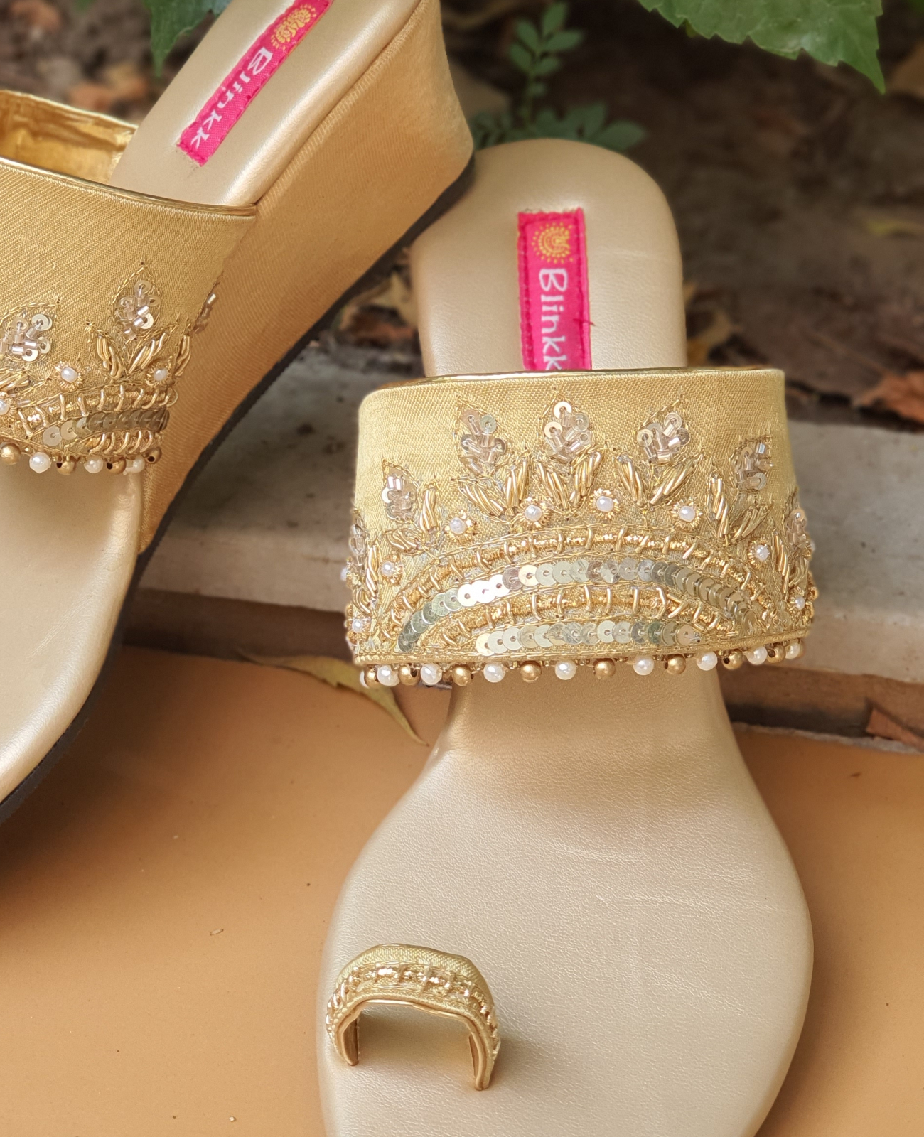 Zardosi, Sequence and Pearls embroidered Wedges in Gold Gaji Silk