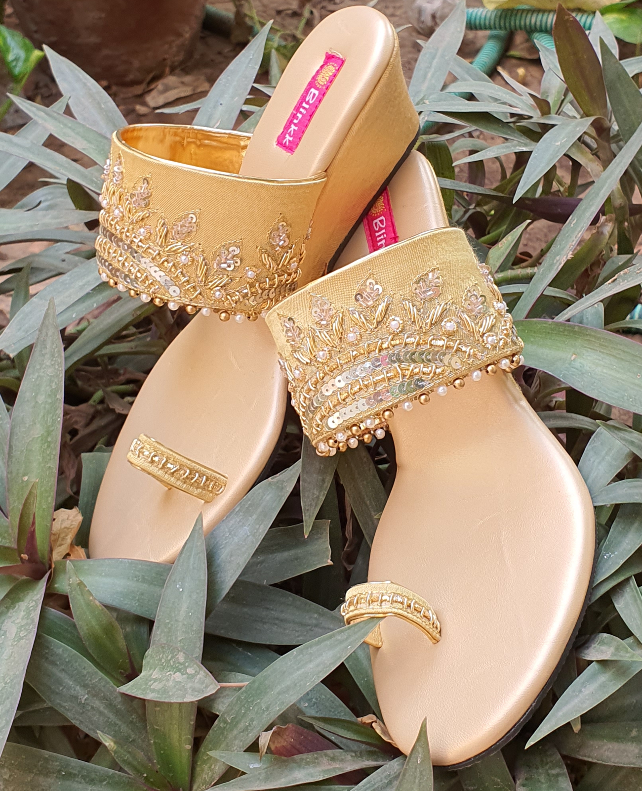 A pair of wedges designed with minimal zardosi, sequence and pearls hand embroidered details. Pair it with a saree, lehenga or kurta-pants set for a royal look.