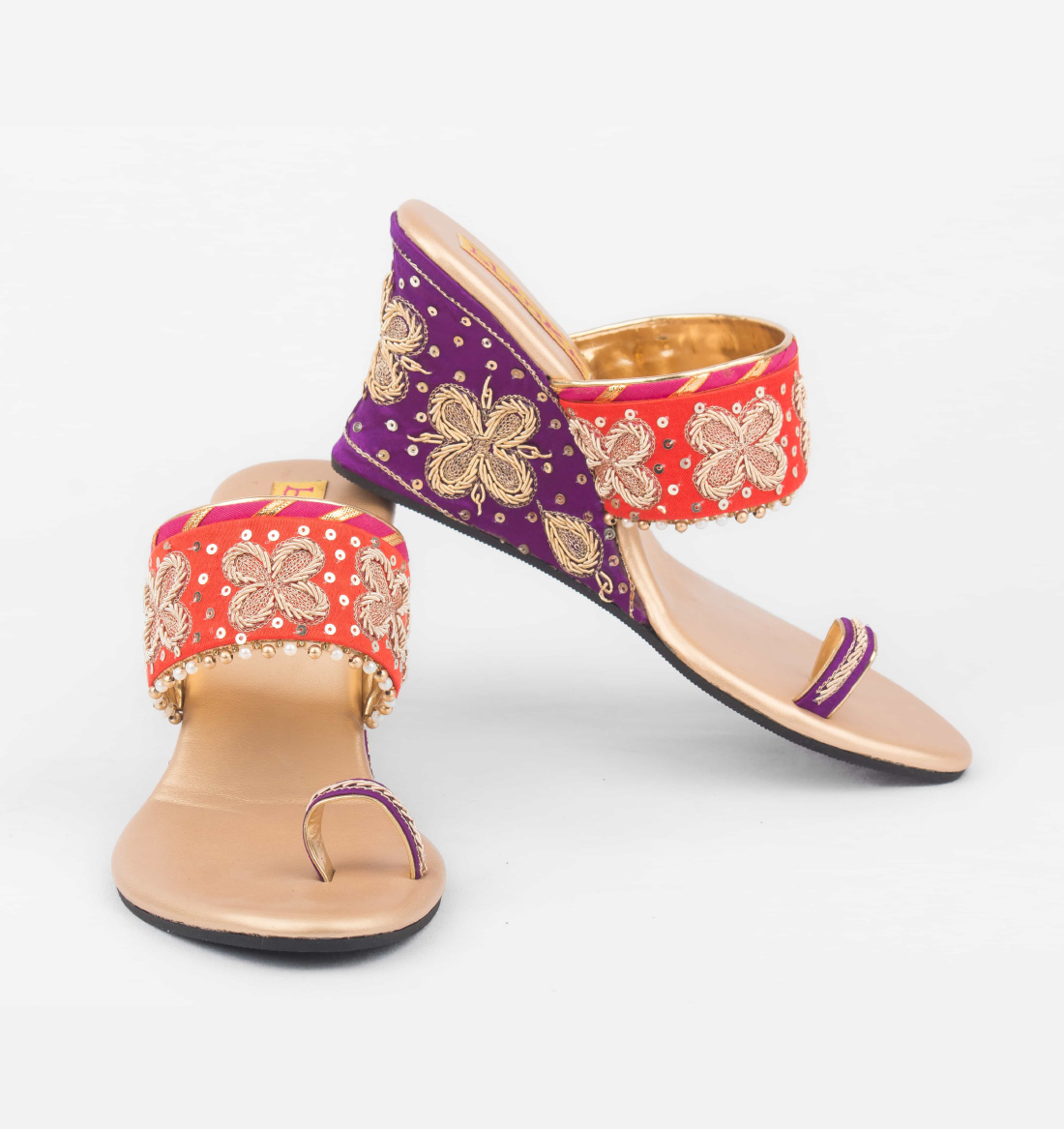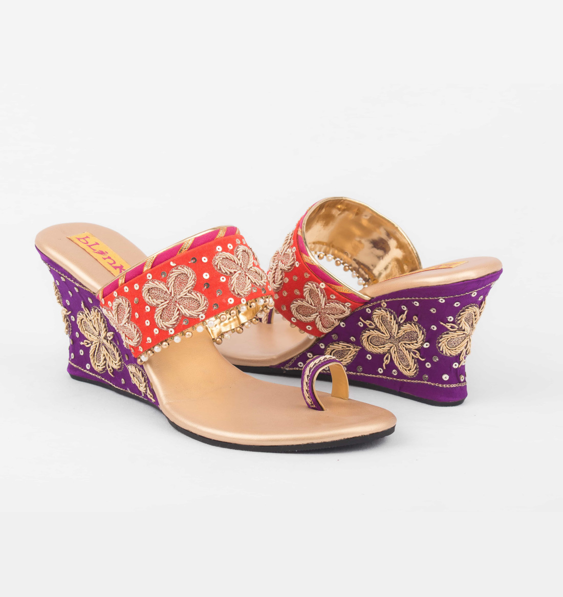 Exquisitely handcrafted pair of wedge heels in orange and purple color embellished with zardosi and sequence work. Pair it with a lehenga or saree for a perfect look.